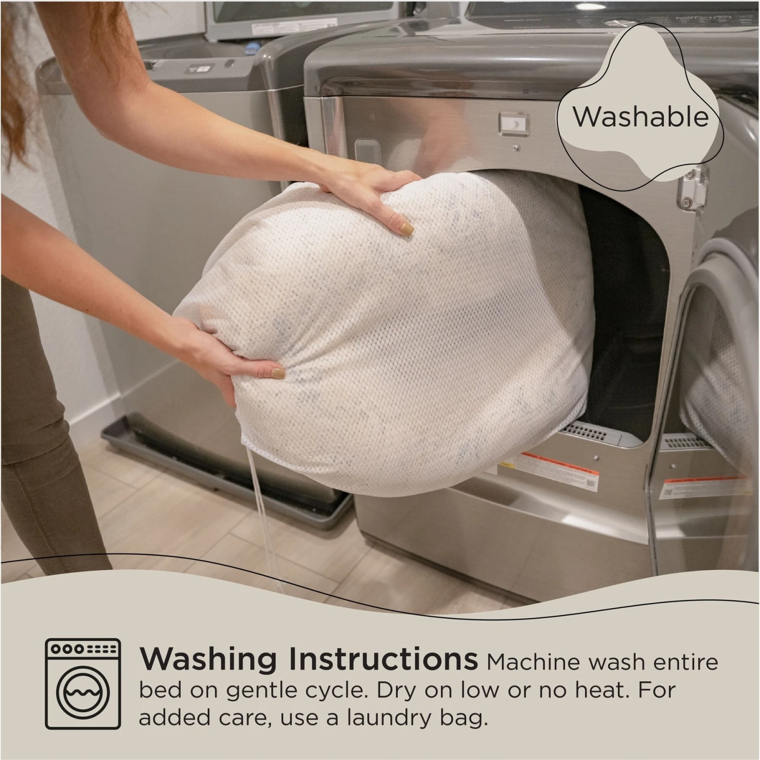 - Machine wash the entire bed on gentle cycle and dry on low or no heat; see pro tips for more details.