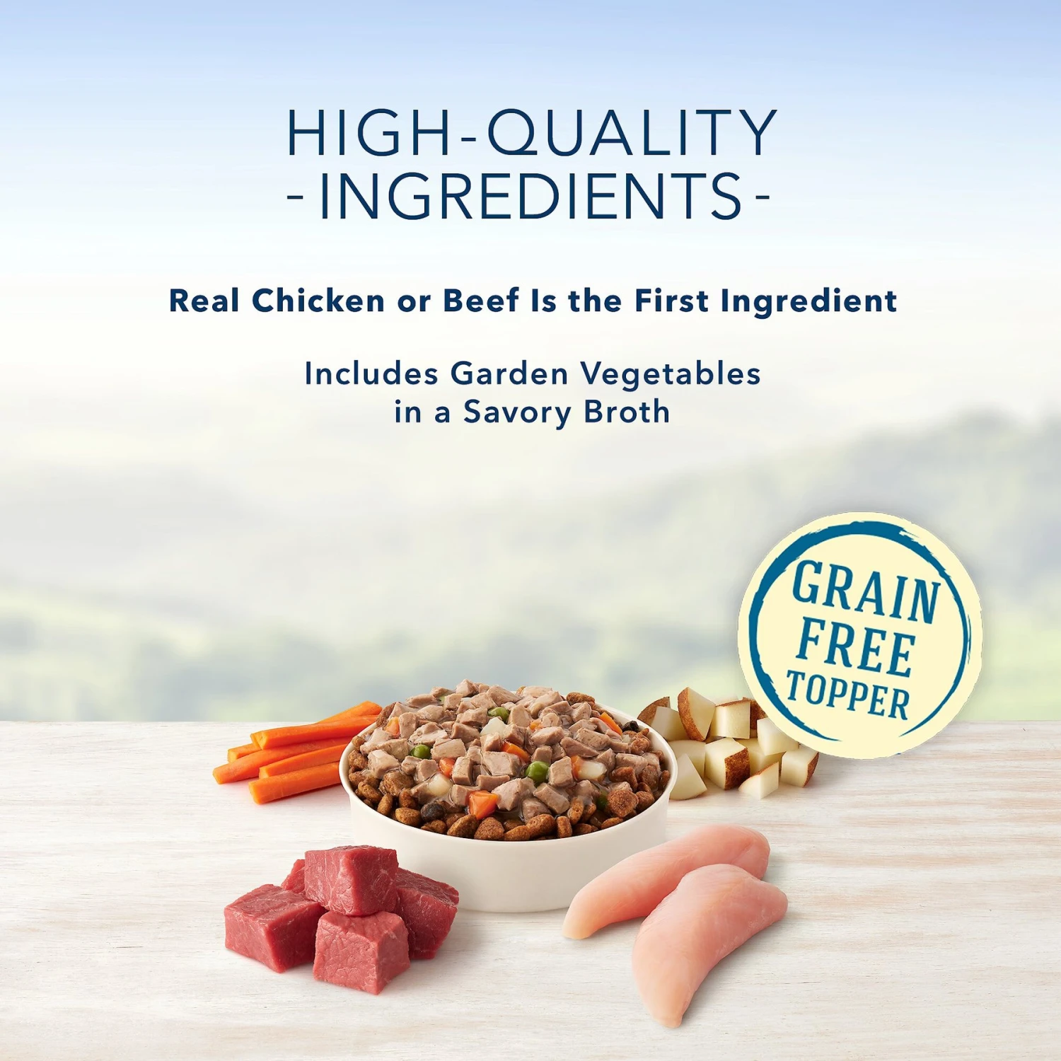 - Starts with meaty morsels of real chicken or beef in a savory broth with garden veggies.