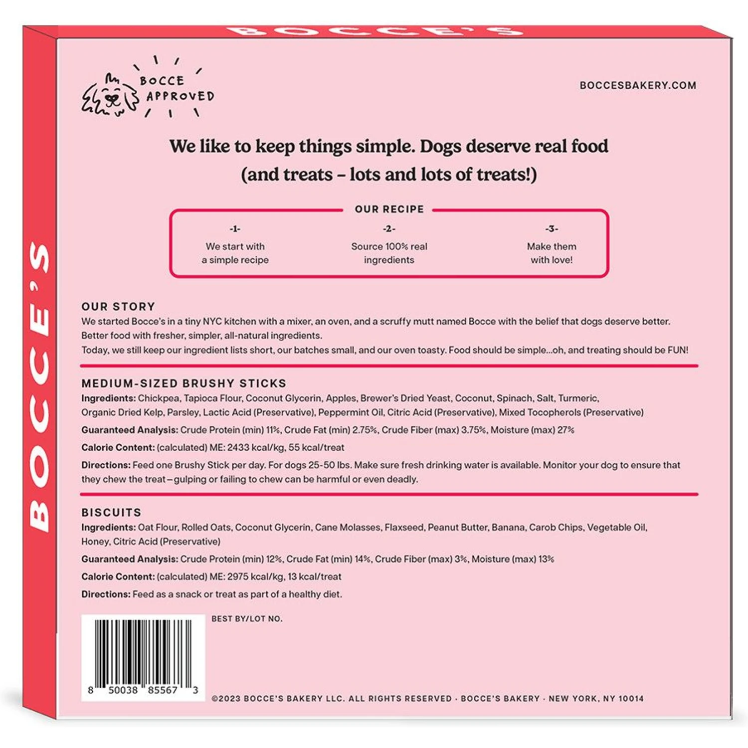 - Both treats are made with real ingredients—the Brushy sticks are crafted with apples, spinach, parsley, and peppermint, while the biscuits include rolled oats, flaxseed, peanut butter, banana, and carob.