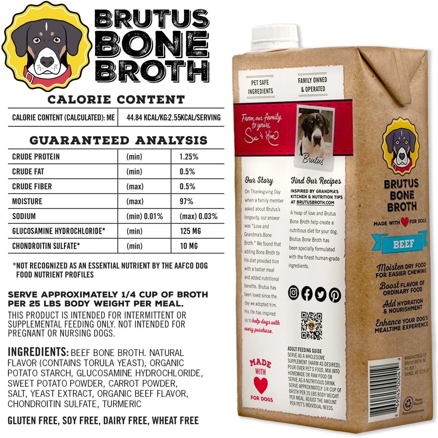 Brutus Broth Bone Broth Beef Flavor Hip & Joint Human-Grade Dog Food Topper, 32-oz box—Add flavor, nutrients and moisture to your dog’s diet with Brutus Broth Bone Broth Beef Flavor Hip & Joint Formula Dog Food Topper! This delectable bone broth is 100% natural, human grade and fortified with turmeric for inflammation, along with glucosamine and chondroitin to support healthy hips and joints. Bone broth is also packed with minerals, nutrients and amino acids to support your dog’s digestive health and his immune system. It’s non-GMO, dairy-free, soy-free, gluten-free and low in fat and sodium. Plus, it’s made without artificial colors, flavors or preservatives. Serve this highly digestible broth it on its own, in liquid form or as a frozen treat, or add it to your dog’s kibble or wet food!