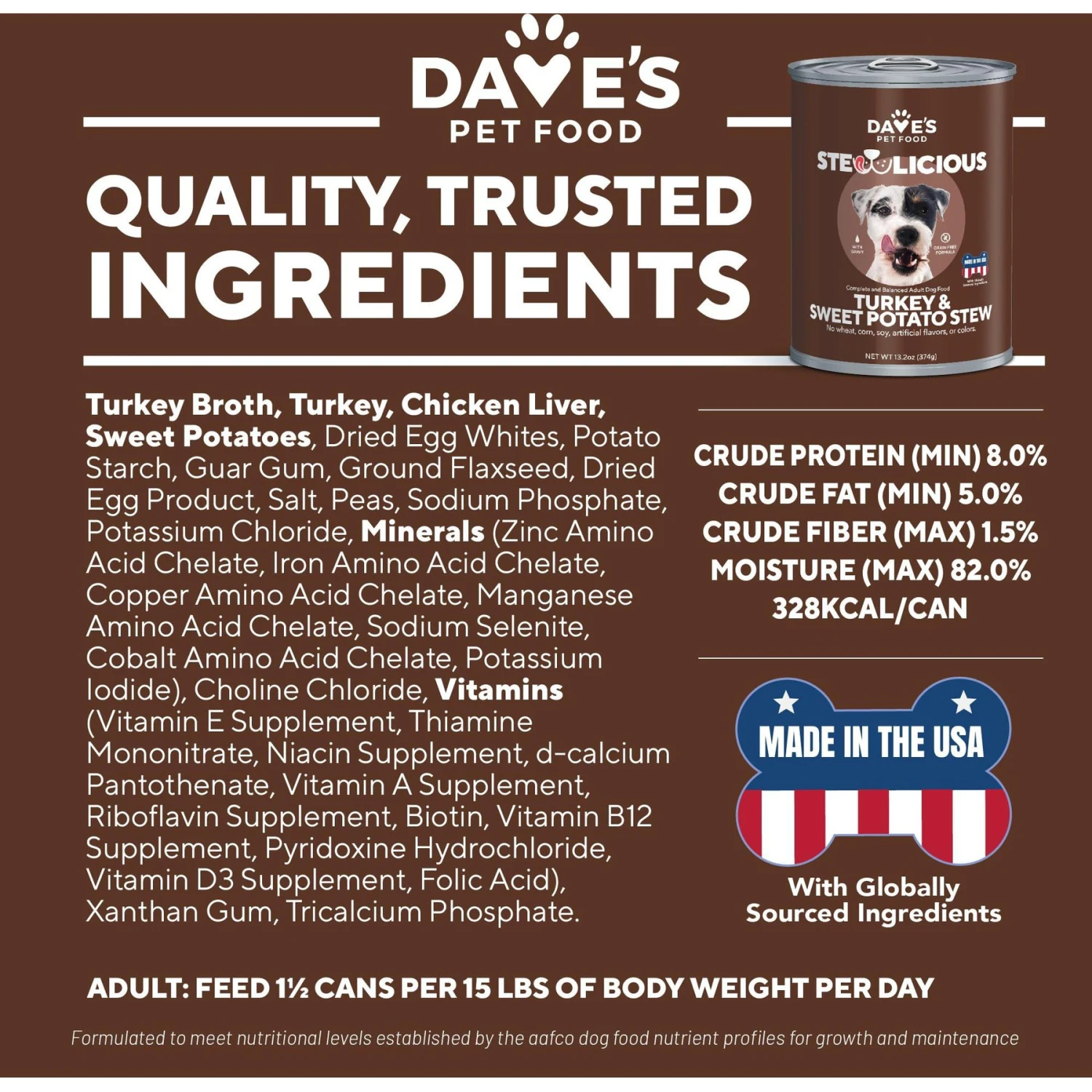 - Grain-free formula made with real turkey, sweet potatoes, and peas, and never any carrageenan, artificial flavors or colors.