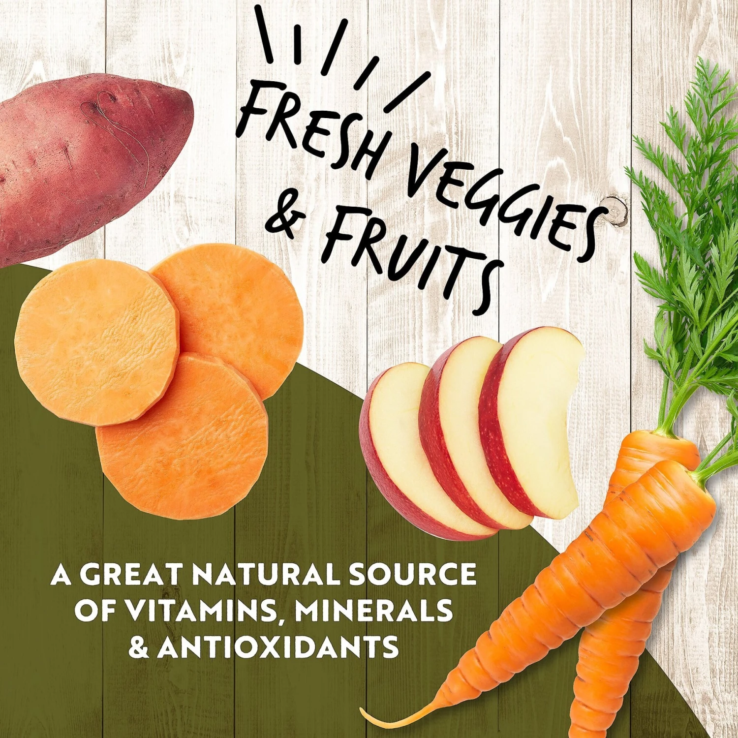 - Lip-smacking recipe is loaded with 95% real chicken meat, plus wholesome fruits and vegetables.