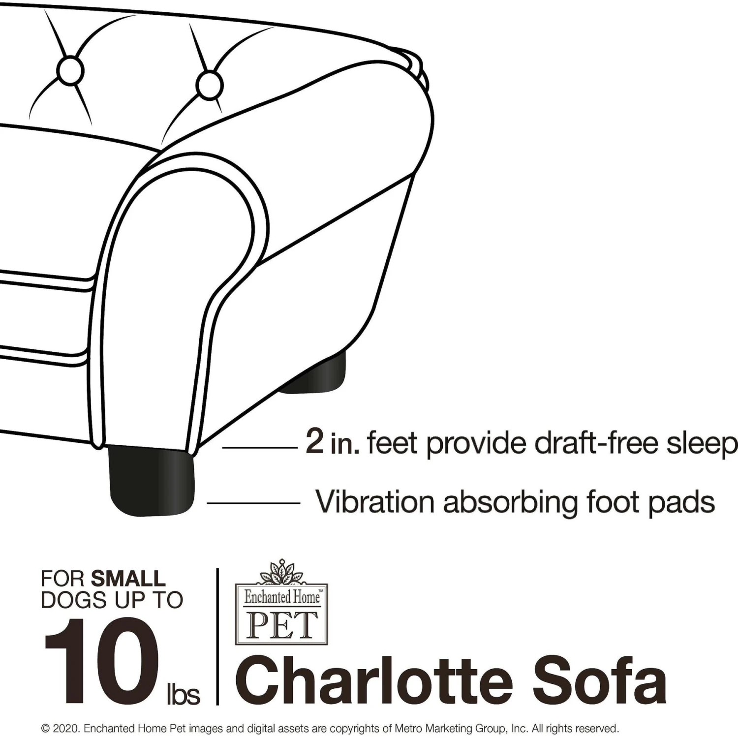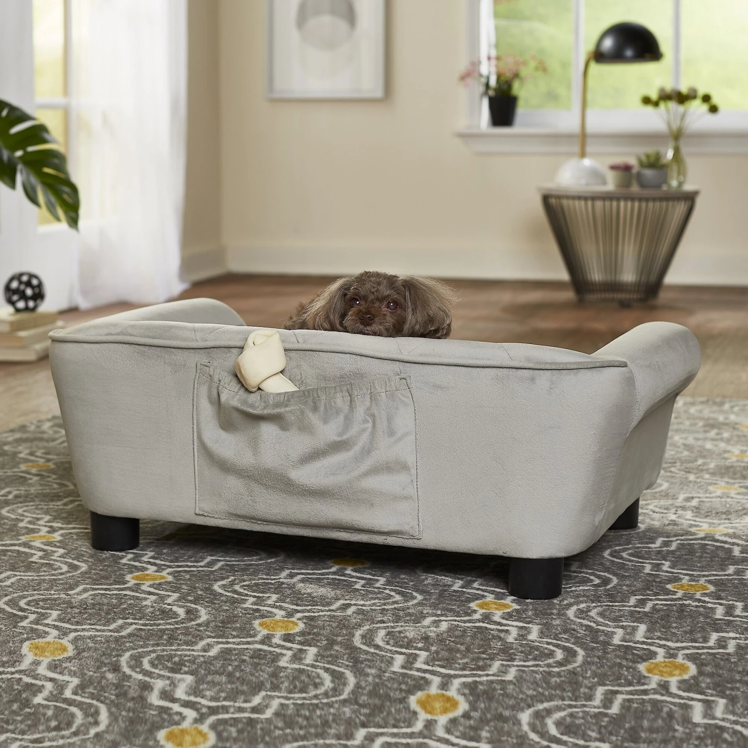 - Classic rolled arms for pets to lean against.