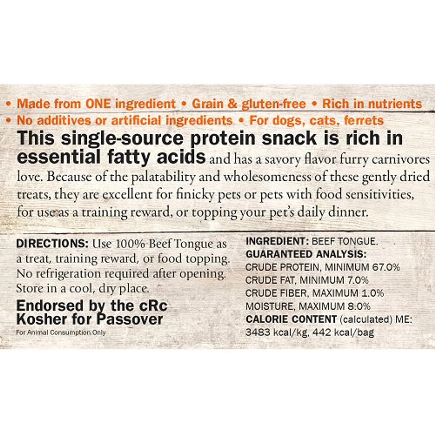 - Single ingredient beef tongue is a nutrient dense treat that can be a treat, training award, food topper, or reconstituted in warm water for 3-5 minutes for a savory snack.