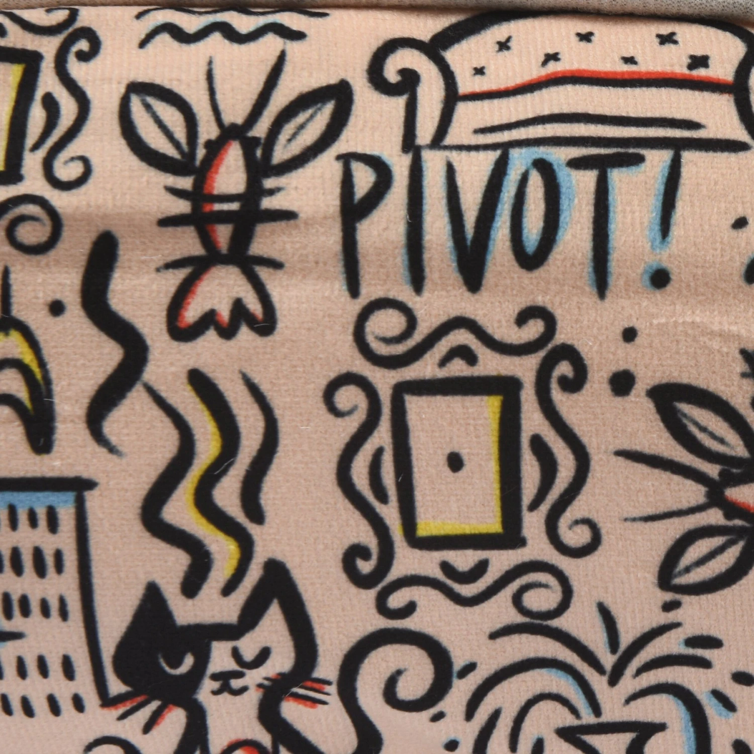- Beige bed is decorated with doodles inspired by your favorite sitcom.