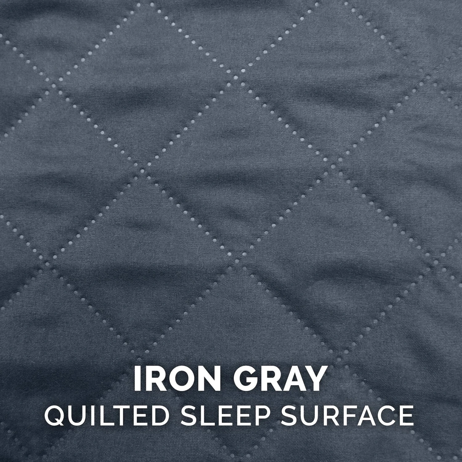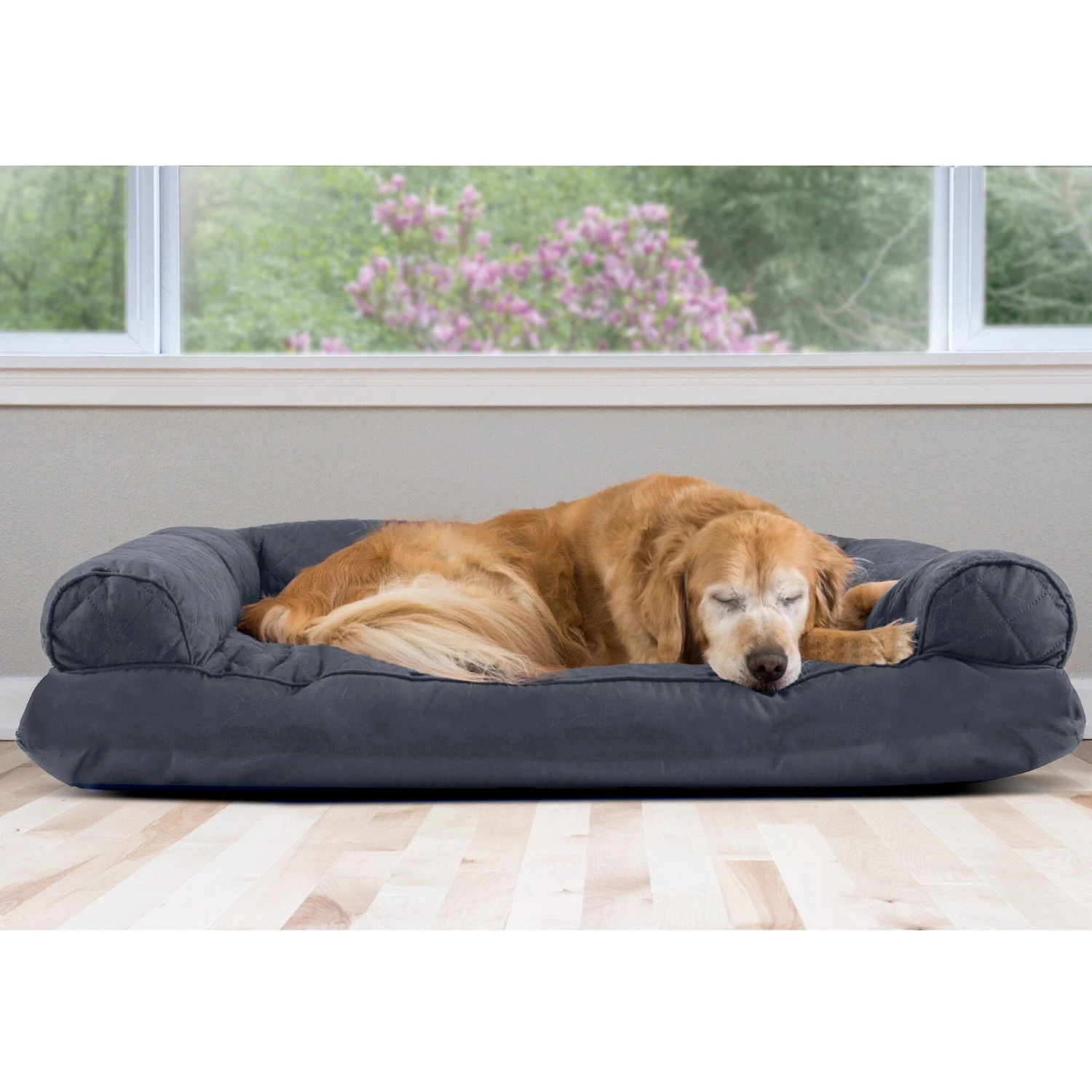 - Sofa-style pet bed with a smooth, quilted sleeping surface.