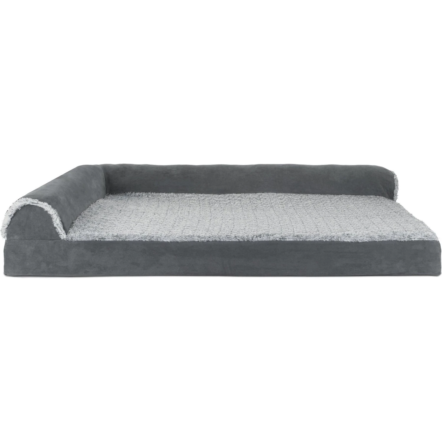 - Sofa-style pet bed with a soft, flecked faux fur sleeping surface.
