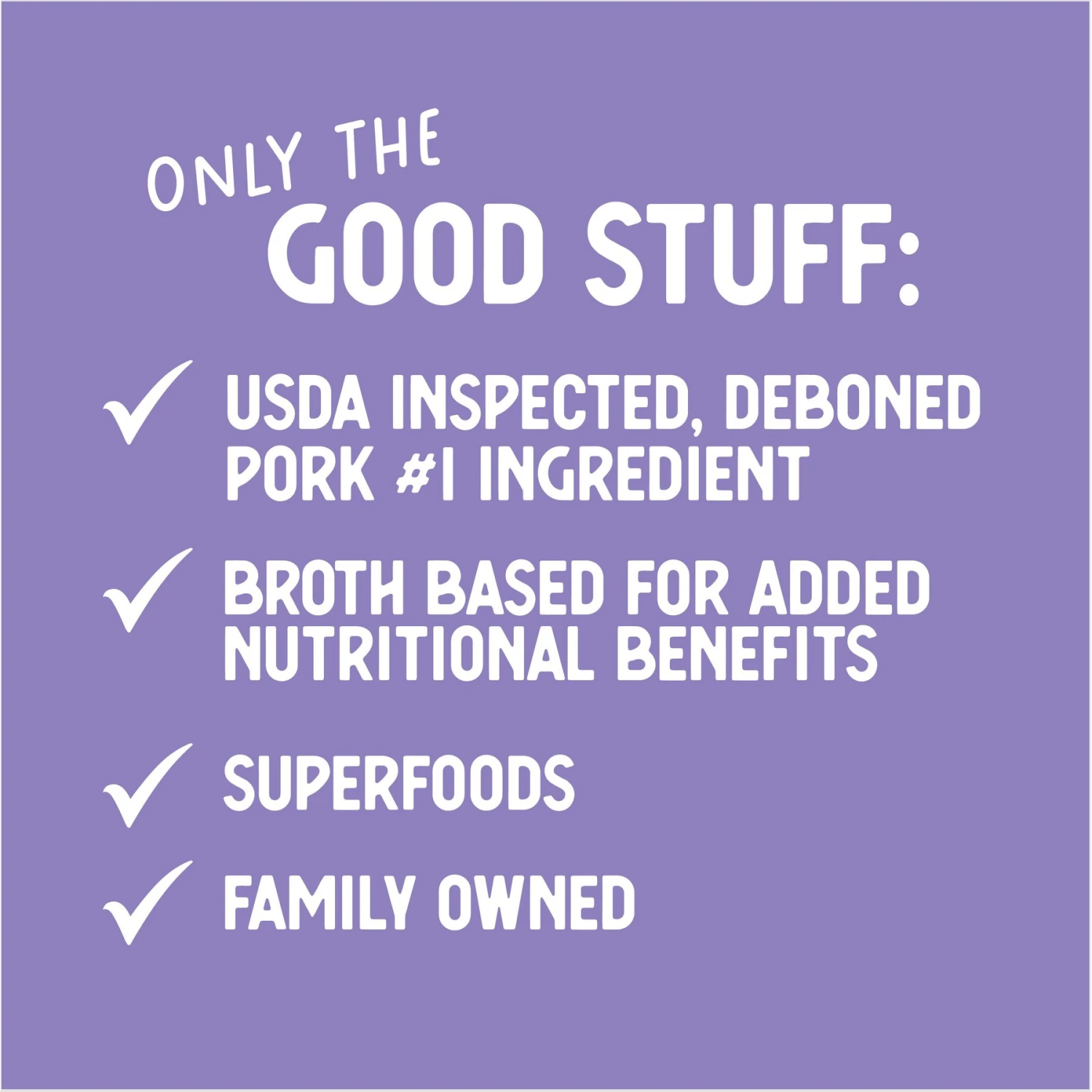 - Grain-free, wet dog food made with delicious pork––great for dogs with sensitivities or allergies to grain.
