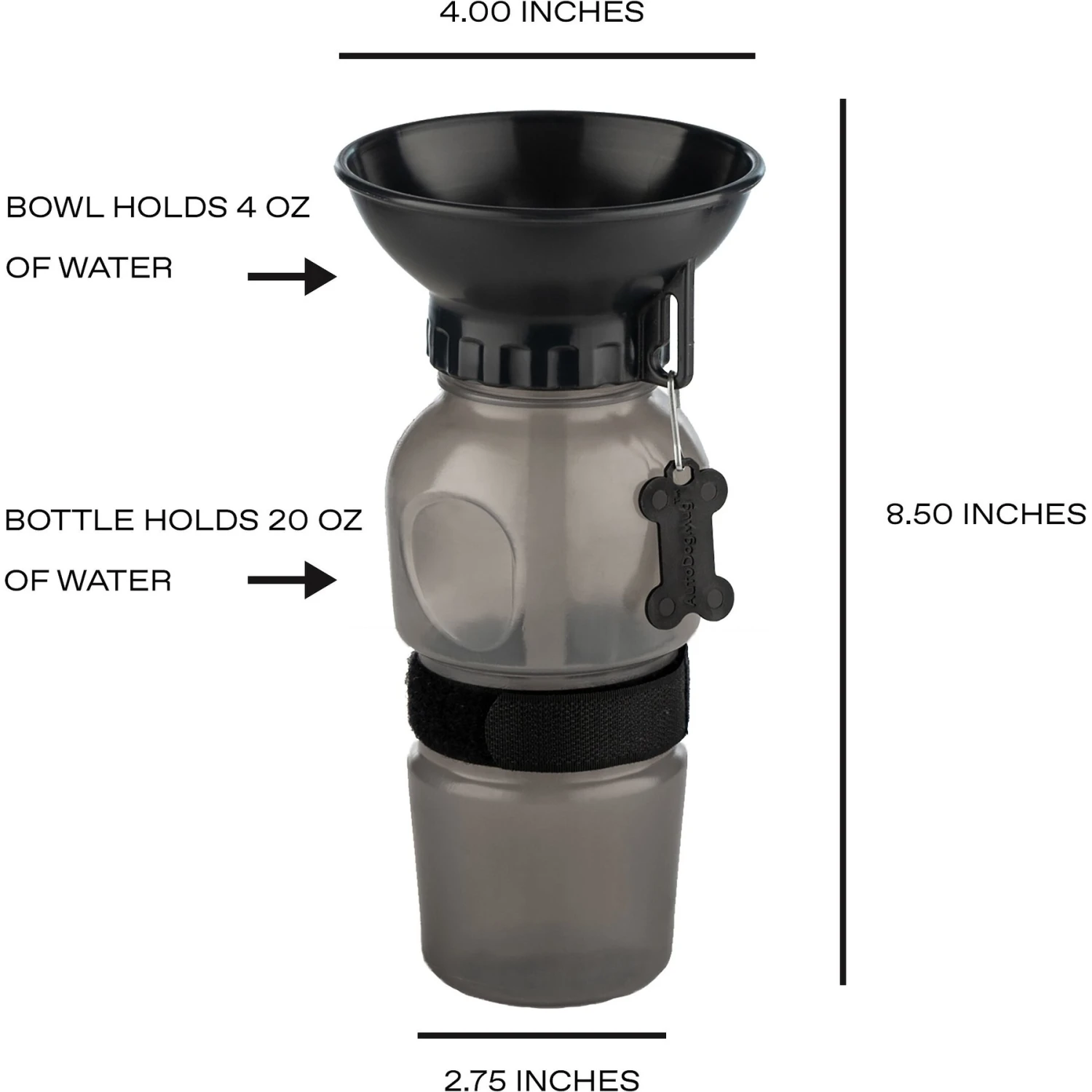 - Squeeze the 20-ounce bottle to fill the attached bowl with water; when he’s done drinking, relax your grip and the remaining water returns to the bottle.
