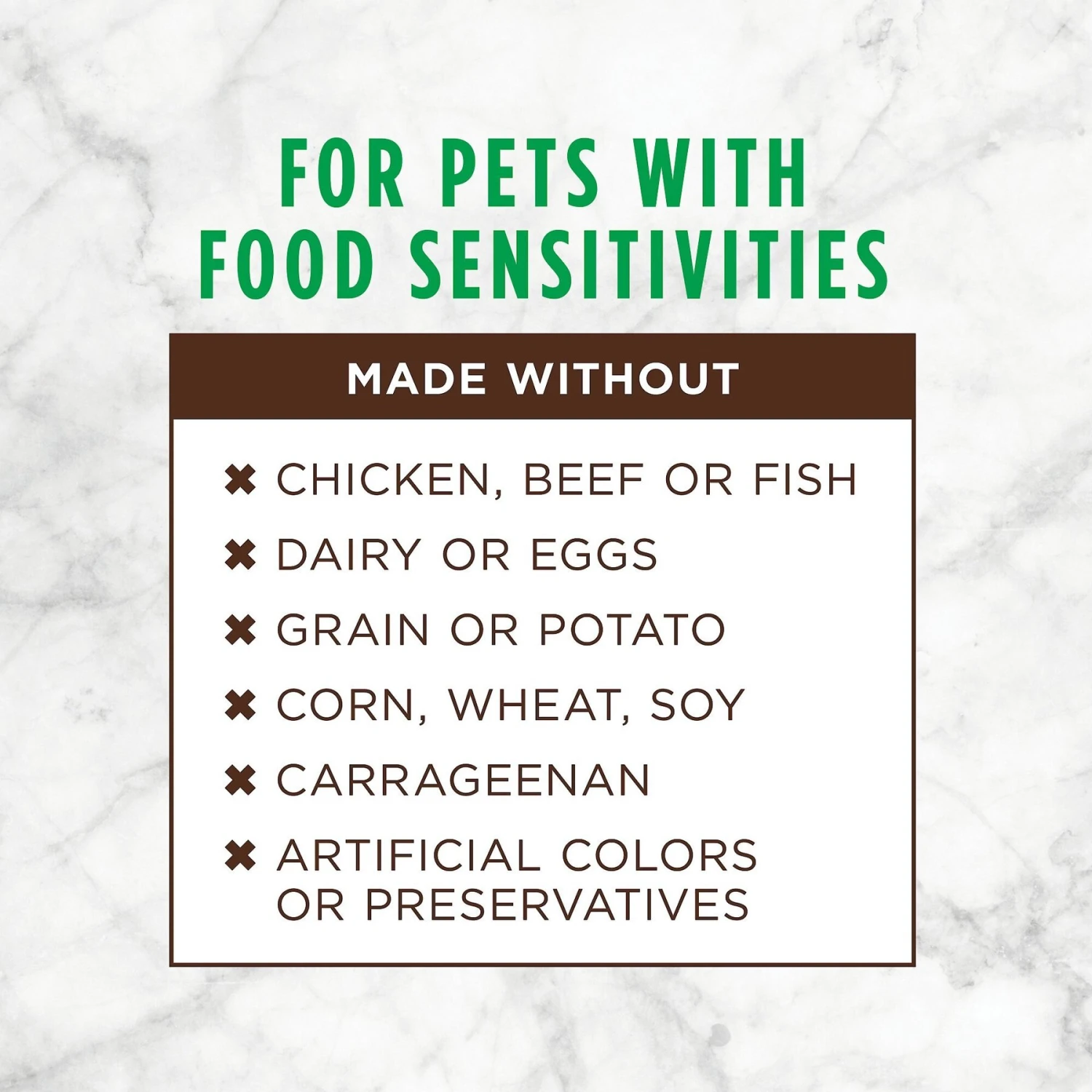 - Features a purposefully simple ingredient list for dogs with food sensitivities–just one animal protein and one vegetable.