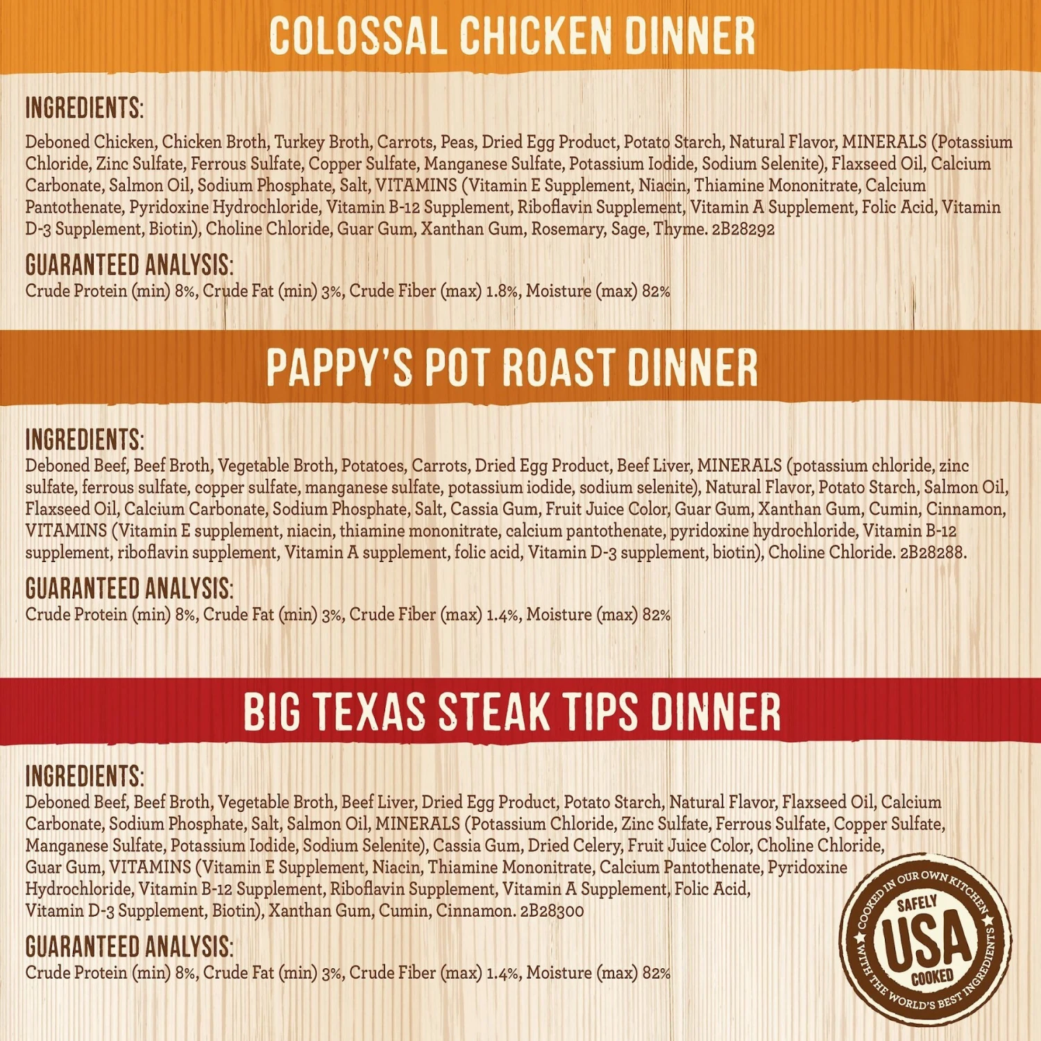 | Flavor | Colossal Chicken Dinner, Pappy's Pot Roast, Big Texas Steak Tips Dinner, Carver's Delight Dinner, Variety Pack |