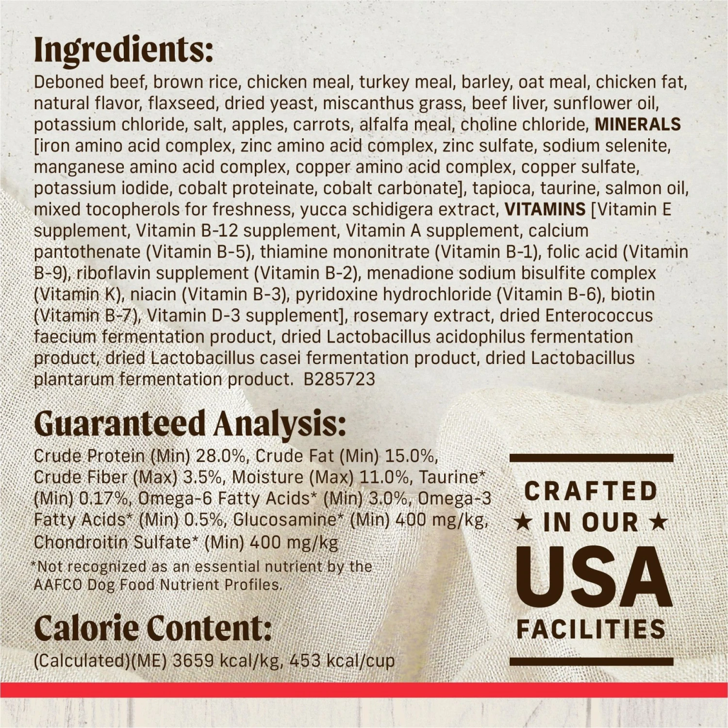 - Real deboned beef is the first ingredient, paired with a blend of whole grains, vitamins, and minerals for a balanced diet.
