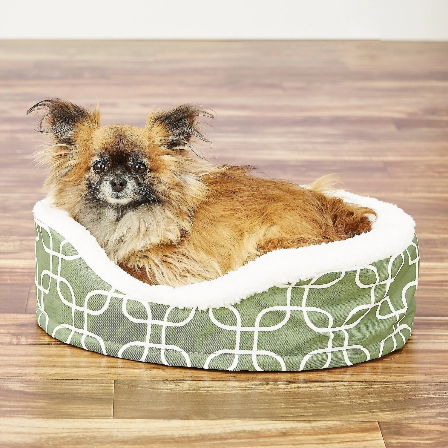 - Pet bed features a durable attractive geometric pattern with a durable fabric that repels pet stains, odors, oils and fluids.