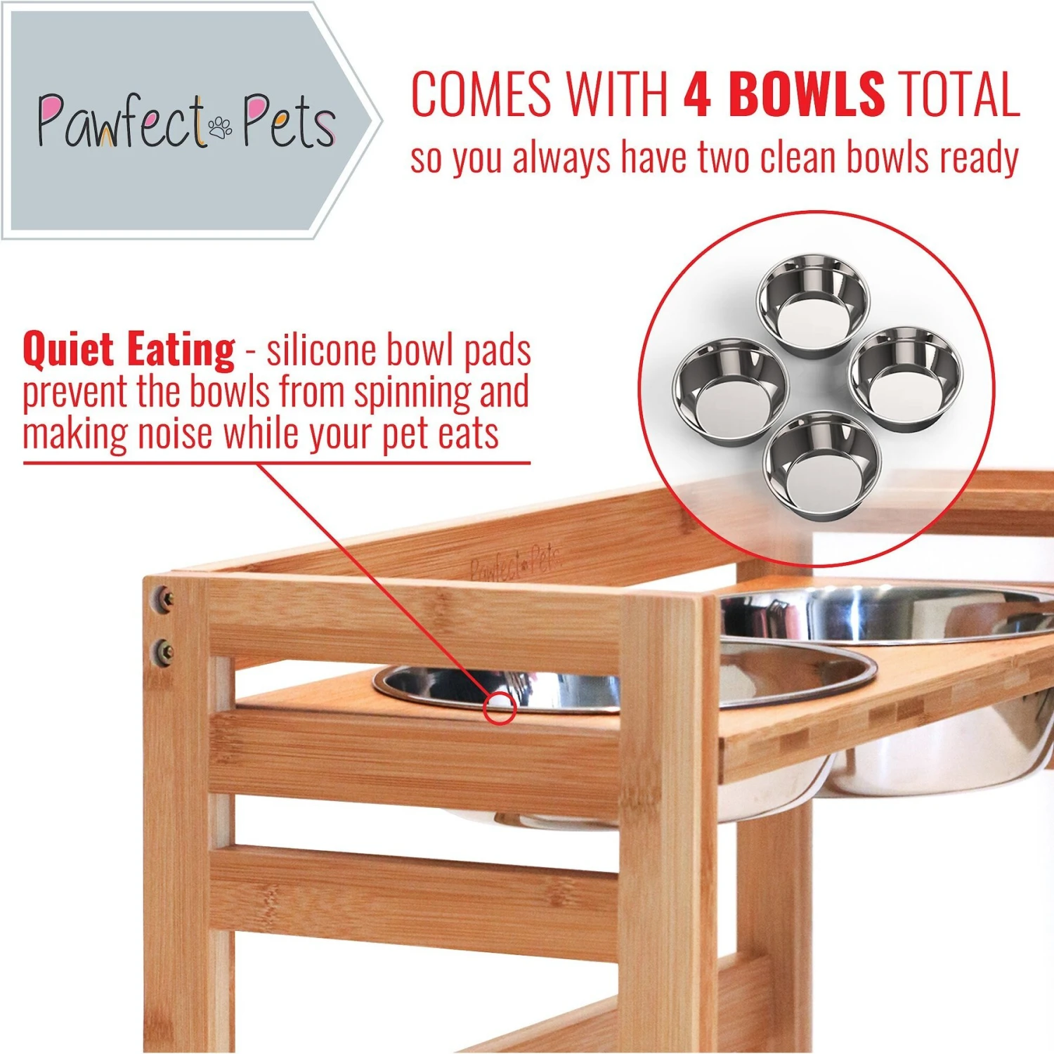 - The silicone pads keep the bowls securely in place without tipping, spilling, or scratching.