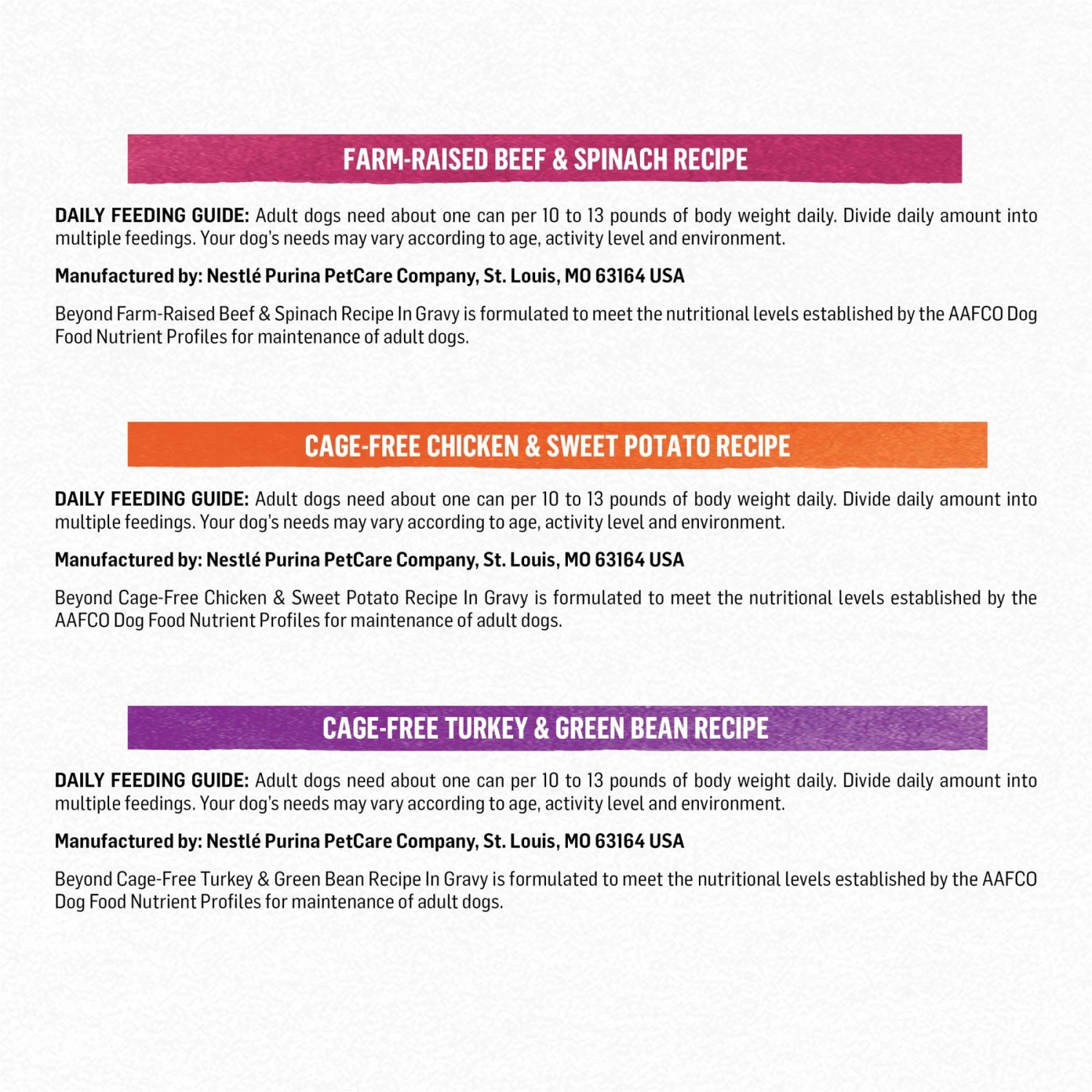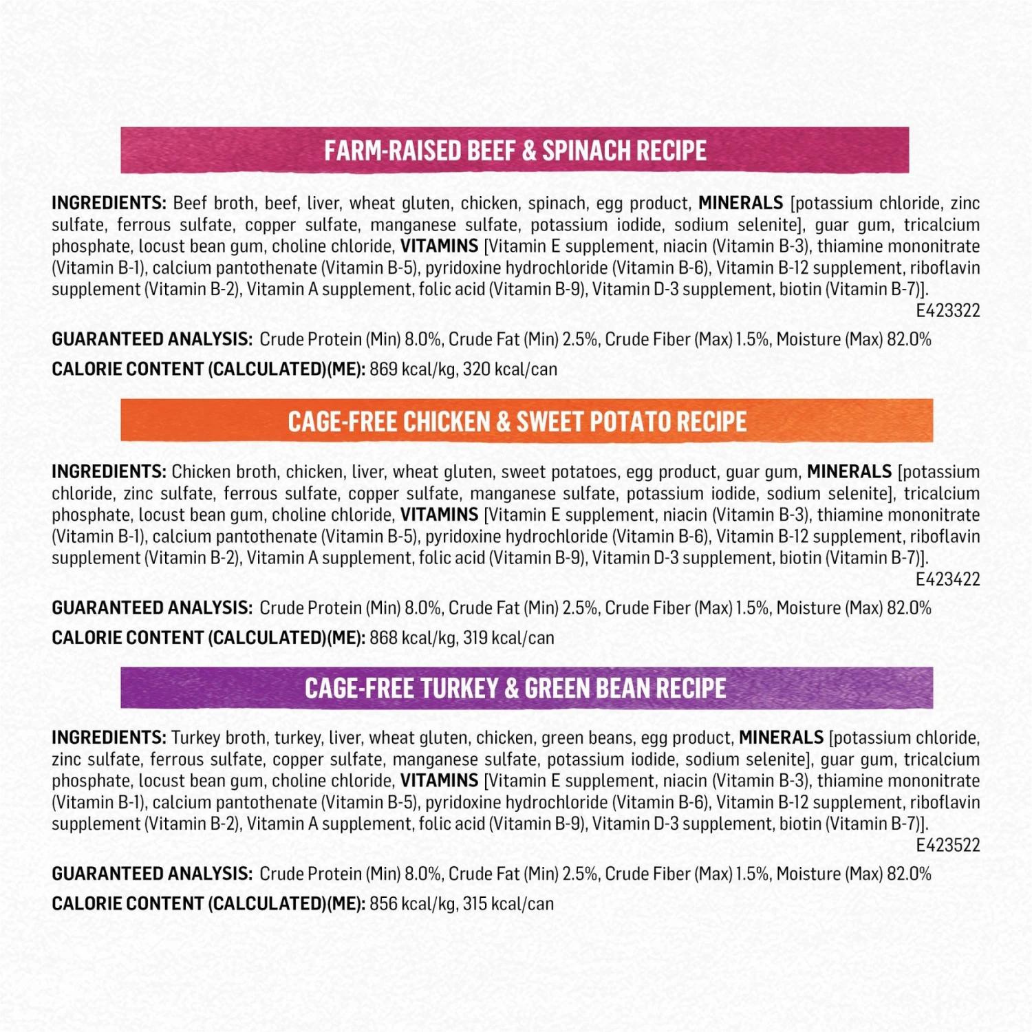 - Variety pack of 3 recipes: Grain-Free Farm-Raised Beef and Spinach in Gravy, Grain-Free Cage-Free Chicken and Sweet Potato in Gravy and Grain-Free Cage-Free Turkey and Green Bean in Gravy.