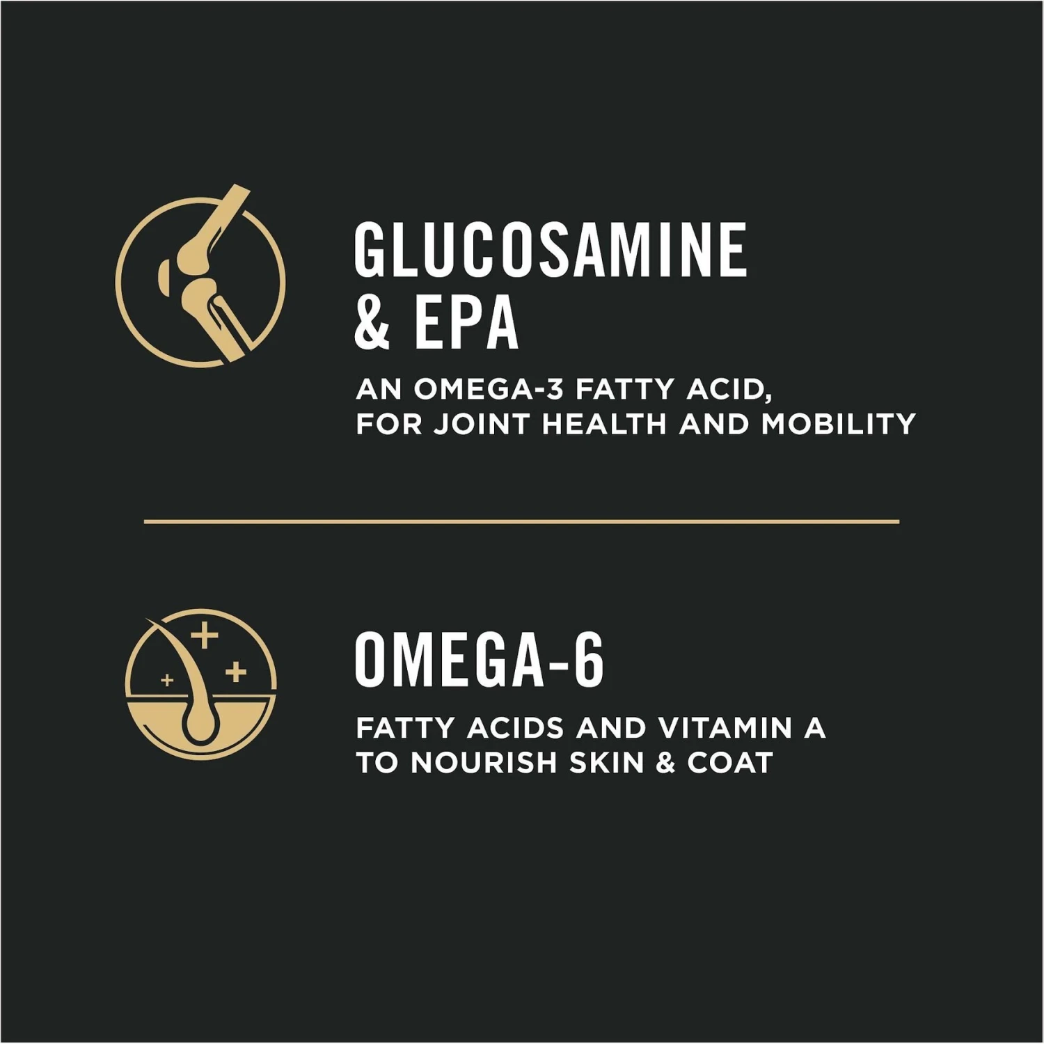 - Aids joint health and mobility with glucosamine and EPA, an omega-3 fatty acid, while DHA helps sustain brain and vision development.