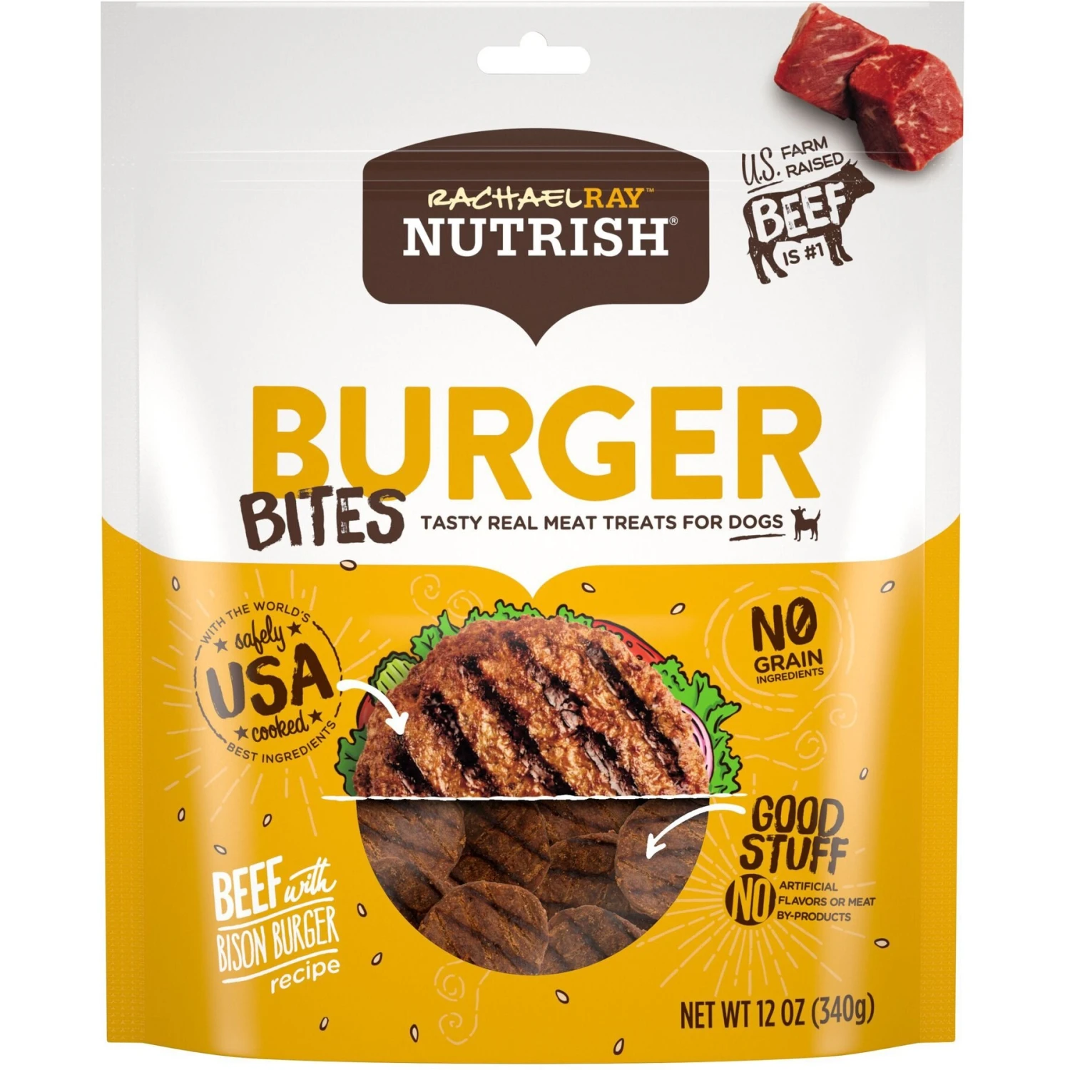 Rachael Ray Nutrish Burger Bites, Beef Burger with Bison Grain-Free Dog Treats, 12-oz bag—Your furry friend’s tail will be wagging with delight once he tries these Rachael Ray Nutrish Burger Bites, Beef Burger with Bison Grain-Free Dog Treats! Shaped just like mini burgers fresh off the grill, these goodies feature real beef as the very first ingredient. They also have a soft texture that’s easy to break apart for smaller pups, making them paw-fect for dogs of all sizes. Each batch is safely cooked in the USA with the world’s finest ingredients, and you can feel extra good knowing that there are no artificial flavors or meat by-products in this recipe. Plus, there are no added grain ingredients, either! You’ll love rewarding your paw-tner with these treats and he’ll love eating them!