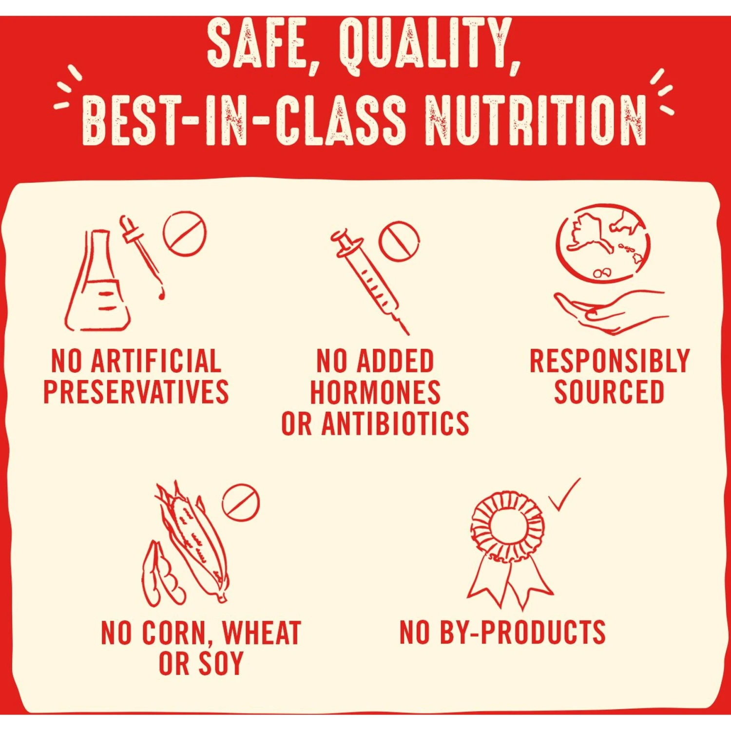 - Formulated to mimic a canine’s natural diet; never contains grains, gluten, fillers, artificial preservatives or colorings.