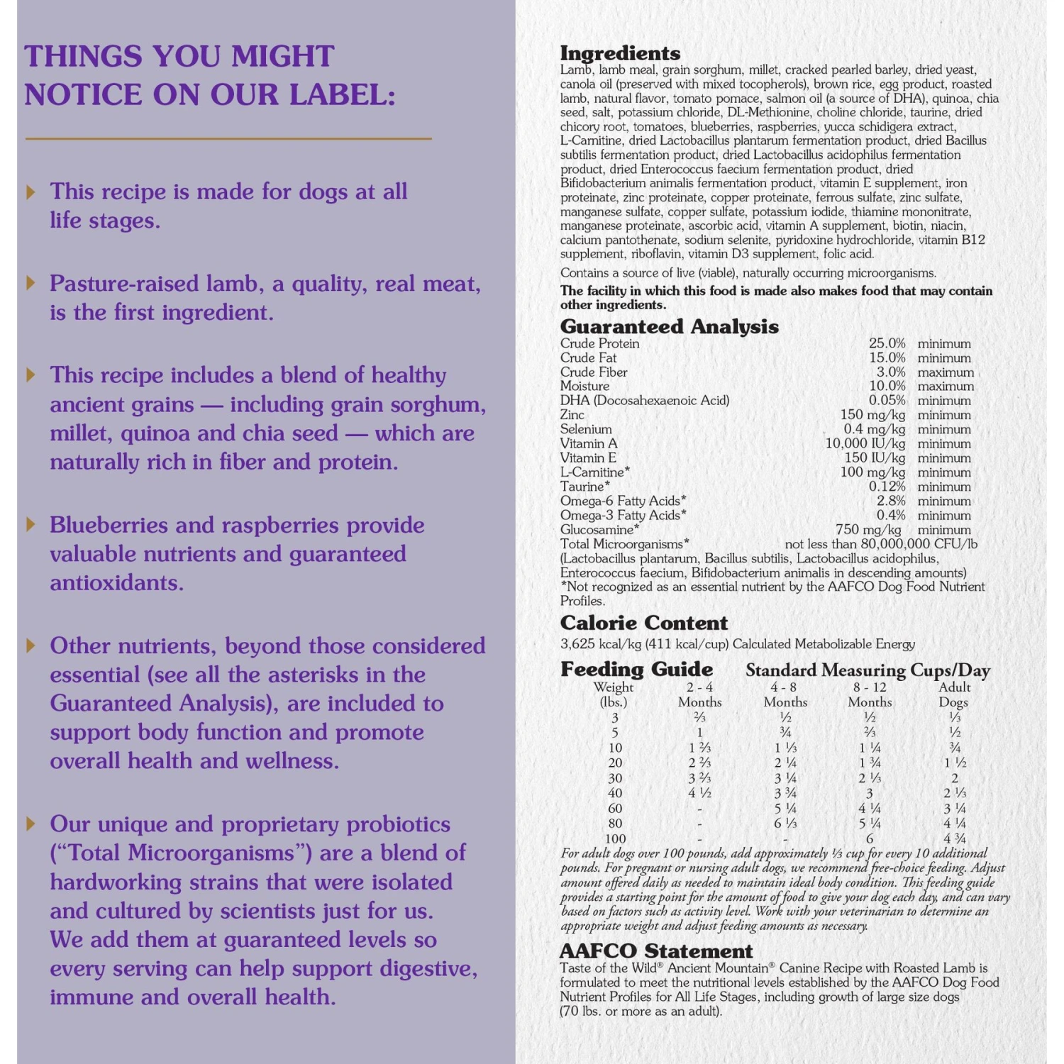 - This roasted lamb dry dog food with ancient grains is crafted with real meat as the #1 ingredient and is high in protein (25%) to help support bones, joints and lean muscles.