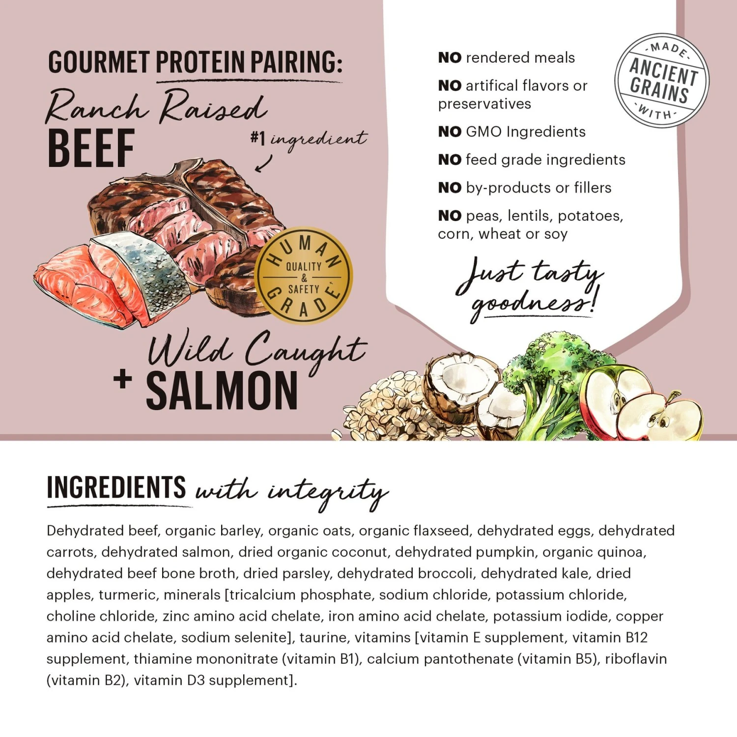- Free of artificial preservatives, by-products, fillers, GMO ingredients, corn, wheat and soy.
