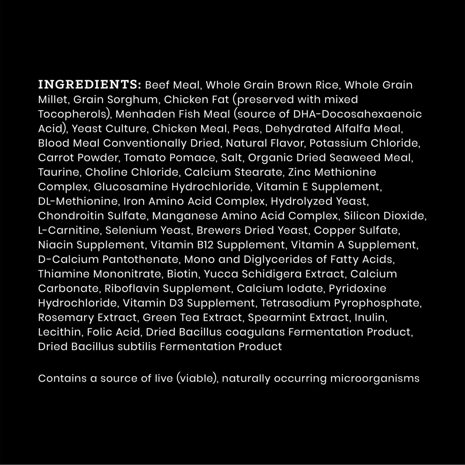 - Sourced and Made in the USA. Nutrient-dense recipe made with premium-quality beef, chicken and fish meals to provide sustained energy.