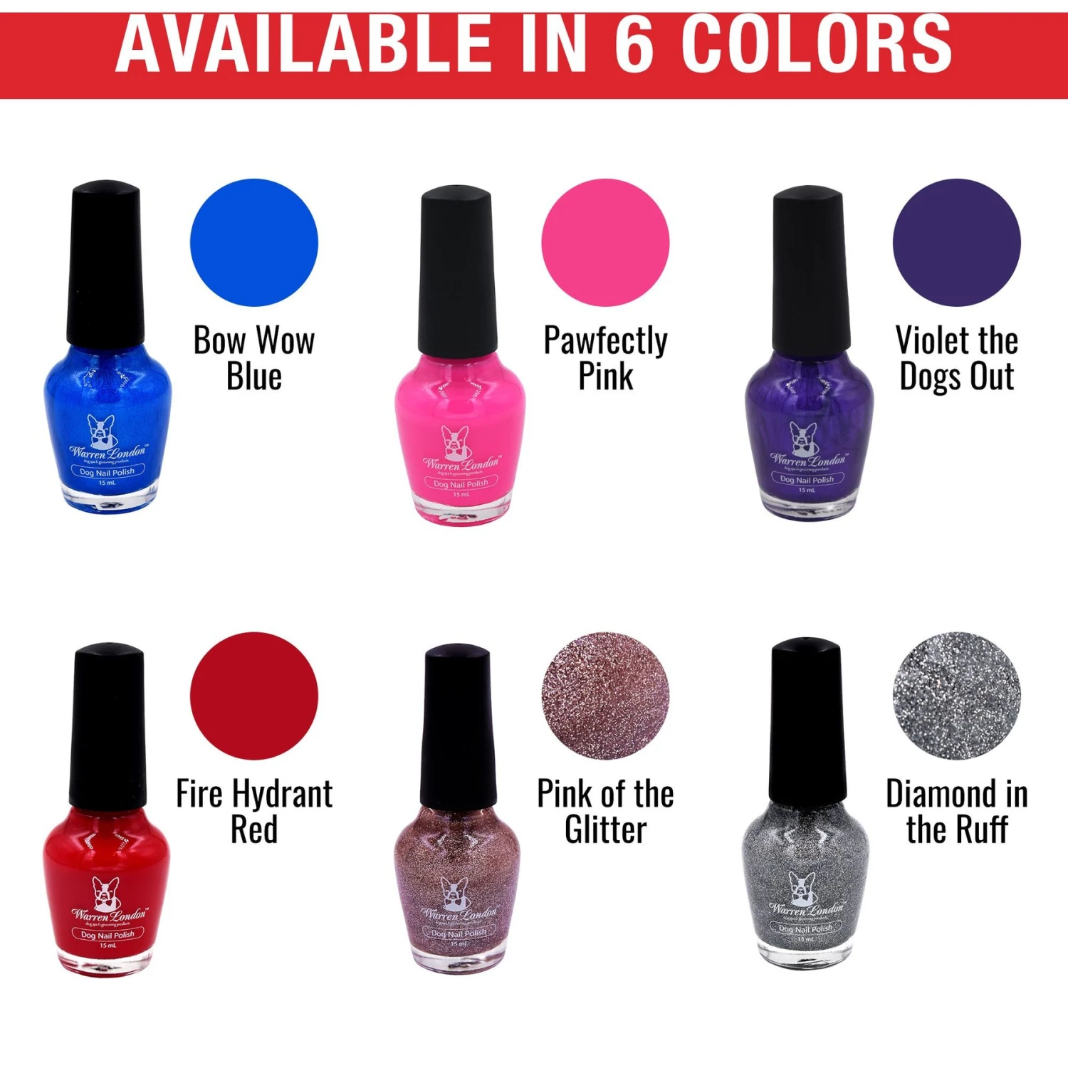 - Six bright color set includes Pawfectly Pink, Violet The Dogs Out (purple), Fire Hydrant Red, Bow Wow Blue, Pink Of The Glitter (sparkle pink), and Diamond In the Ruff (sparkle silver).