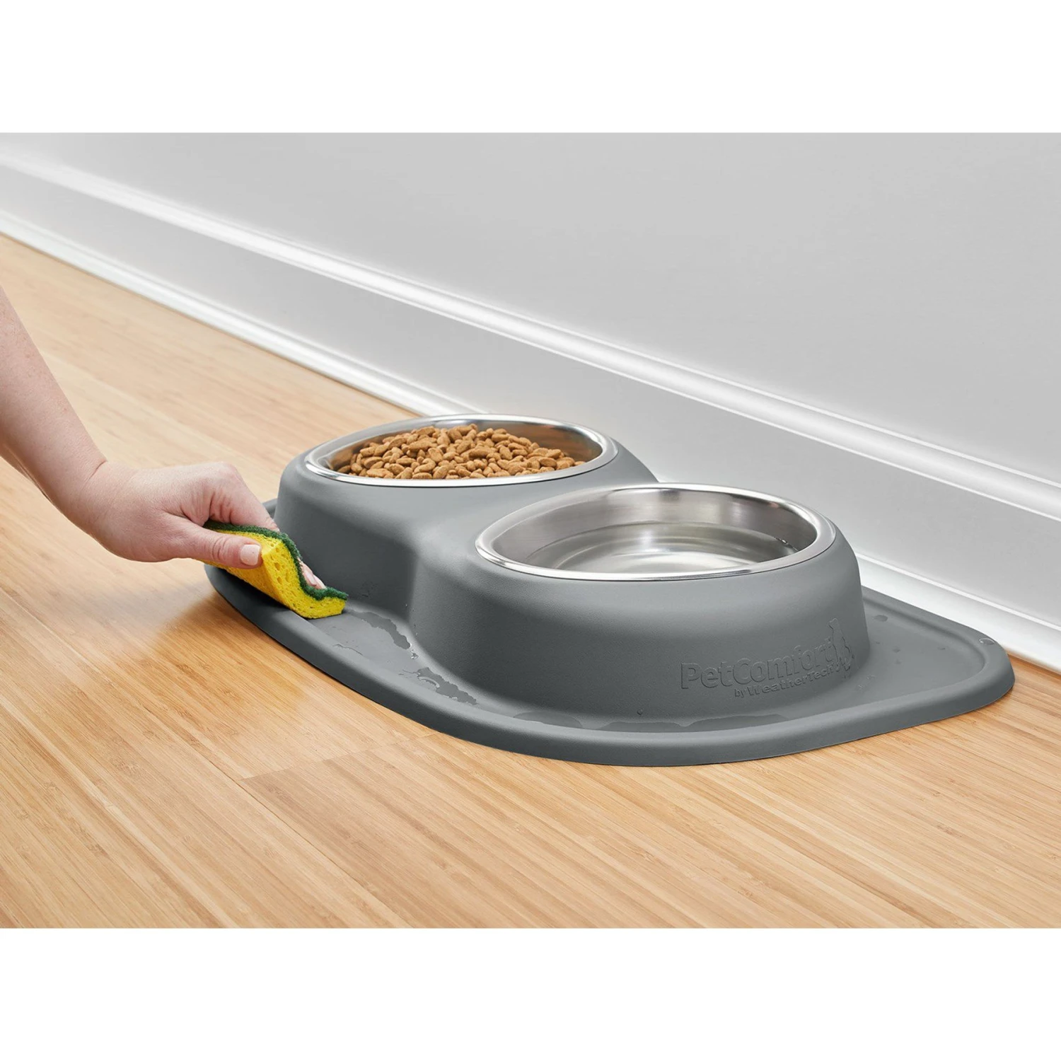 - Features a bowl stand with a sloped surface so food and water spills go onto the mat below not on your floor.